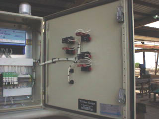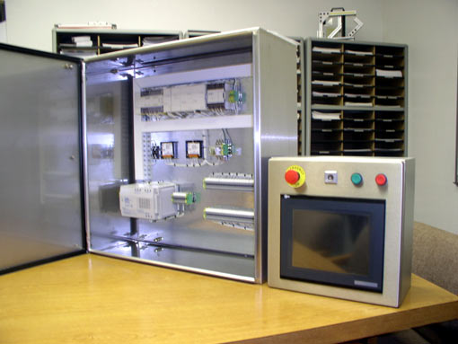 Control enclosure for a hydraulics test stand. Smaller enclosure contains the flat panel display for operator. The larger enclosure held the PLC and valve drivers and served as an interface to a third pump control enclosure.